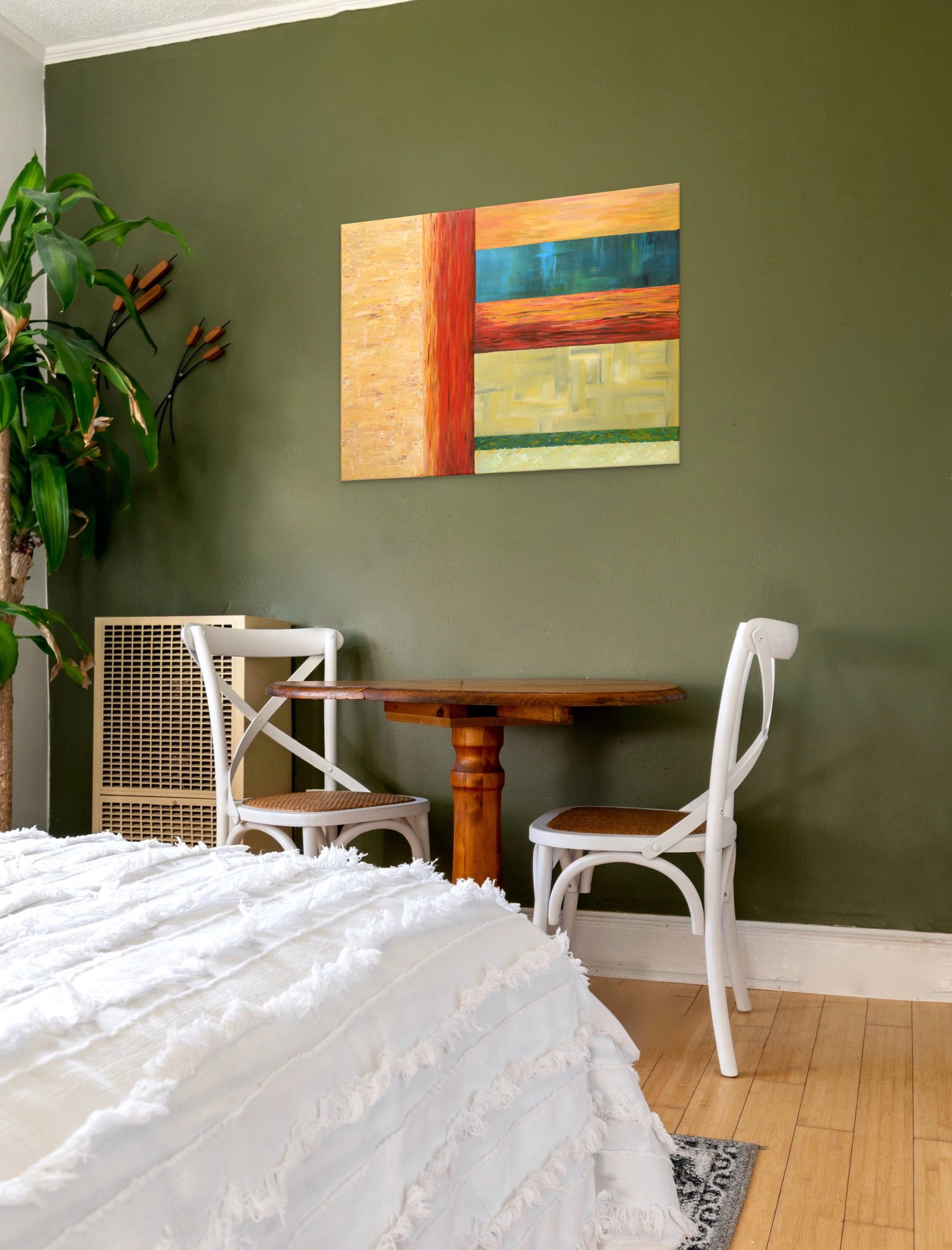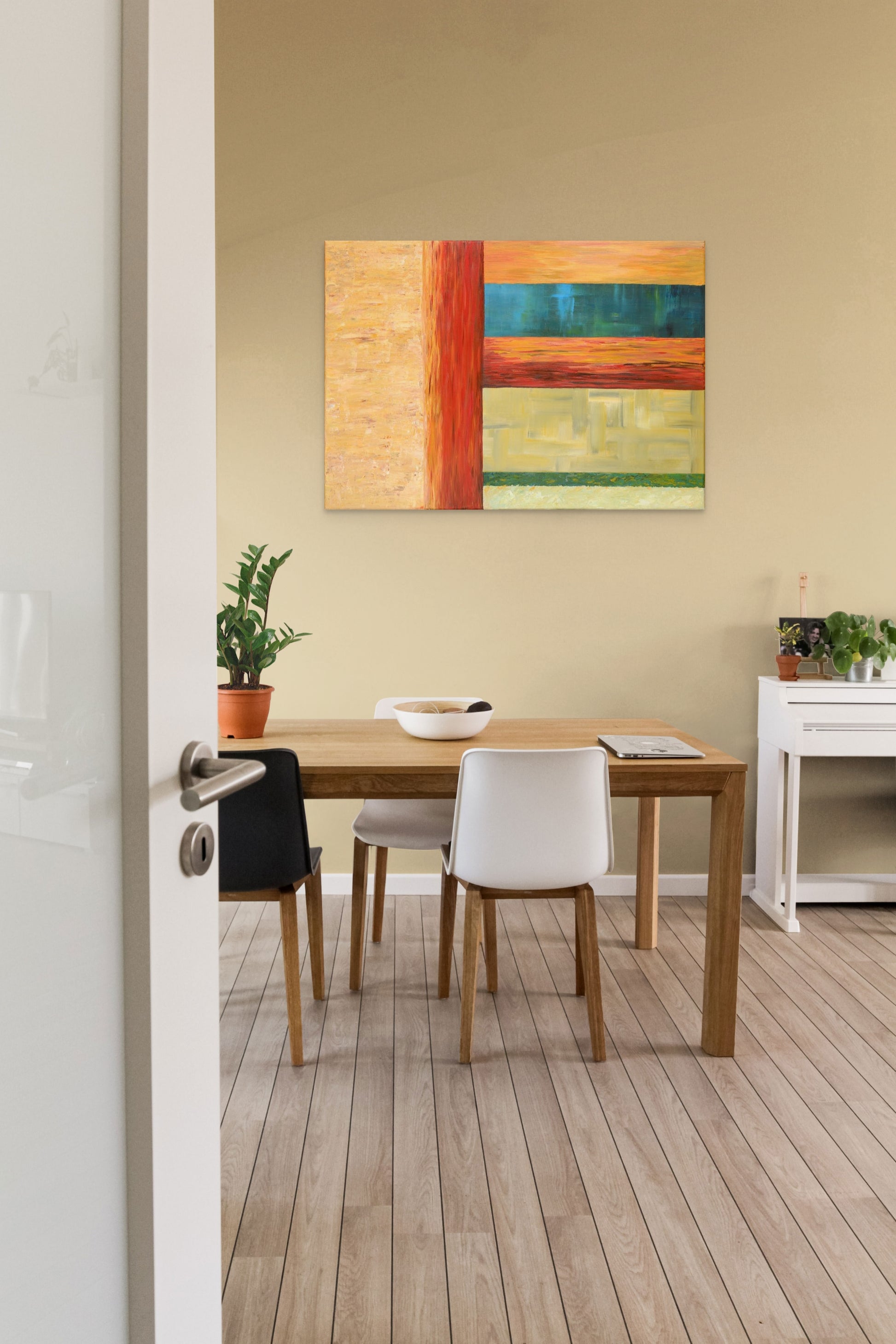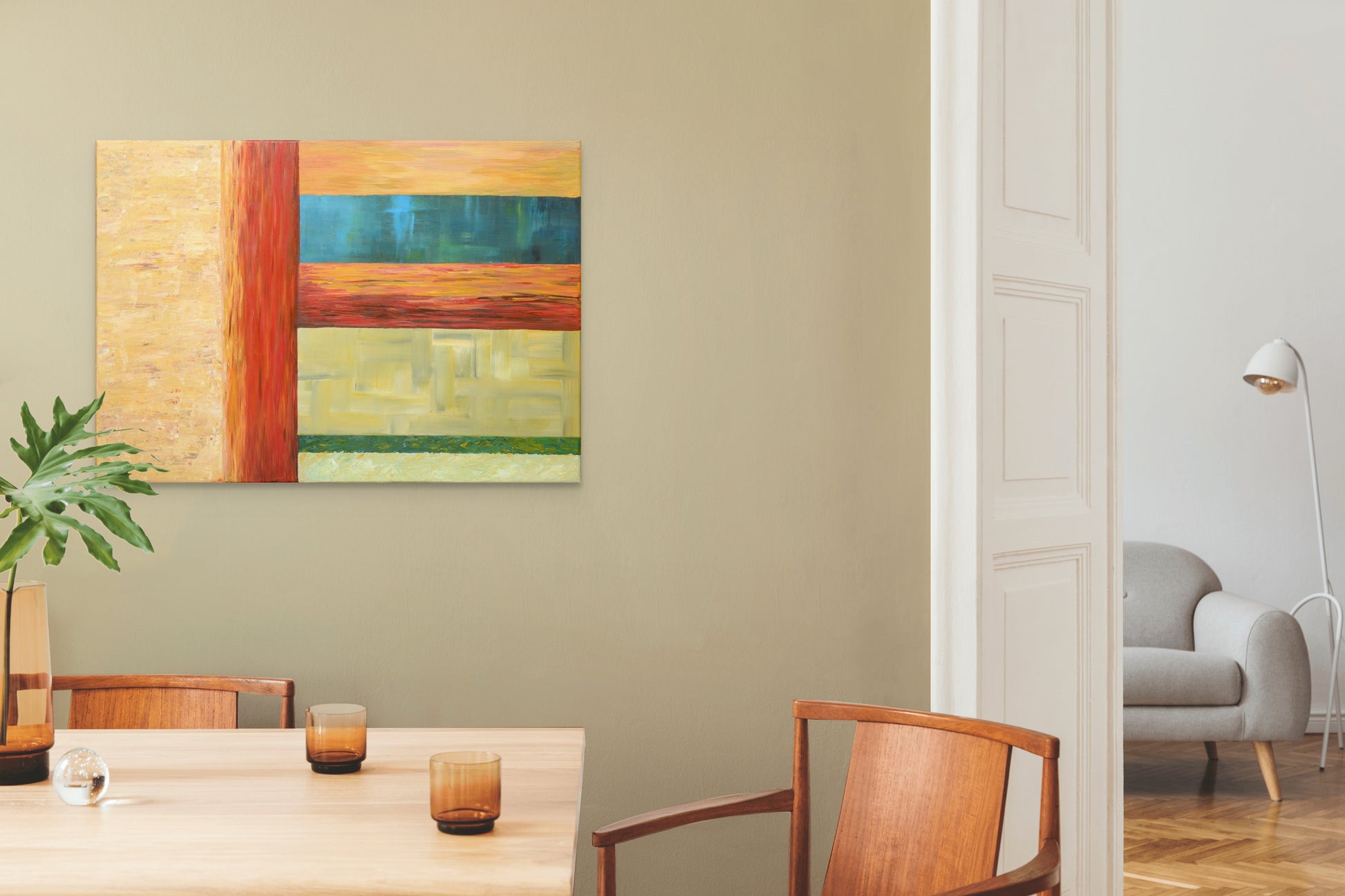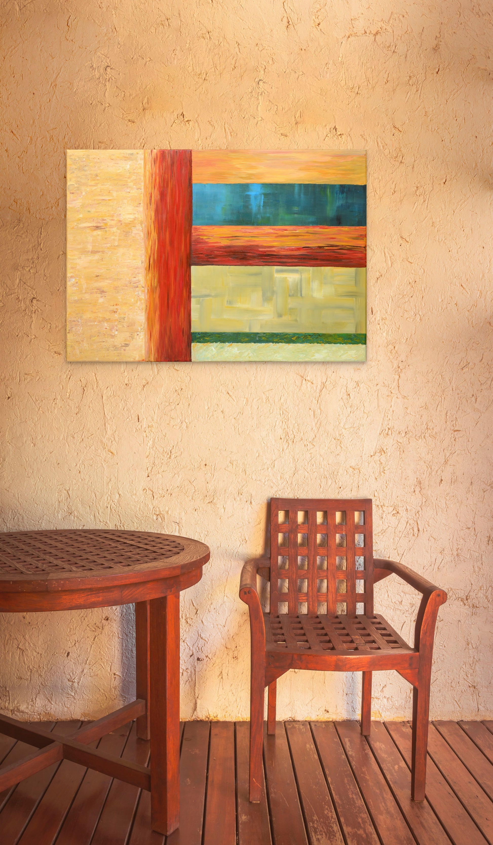 Ten projekt przedstawia eksplorację geometrii i koloru. Kompozycja podzielona jest na bloki i paski o kontrastujących odcieniach, a każda część stanowi odrębny świat, a jednocześnie część większej, harmonijnej całości. Złoto-żółte odcienie mogą reprezentować światło i otwartość nowych początków, podczas gdy ognisty czerwony pasek może symbolizować barierę lub odważną smugę pasji przecinającą płótno. Chłodne błękity i zielenie w centralnym prostokącie mogą sugerować okno lub portal prowadzący do spokoju pośród otaczającego ciepła. Obraz ten można postrzegać jako metaforę różnych aspektów ludzkiego doświadczenia – emocji, rozumu, spokoju i intensywności – a wszystko to zawarte jest w geometrycznych i barwnych granicach naszego życia, tworząc bogatą mozaikę.